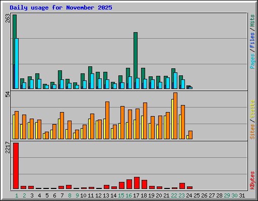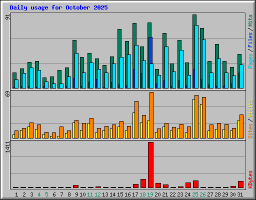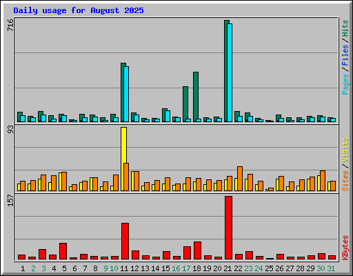 | Day | Hits | Files | Pages | Visits | Sites | KBytes | ||||||
